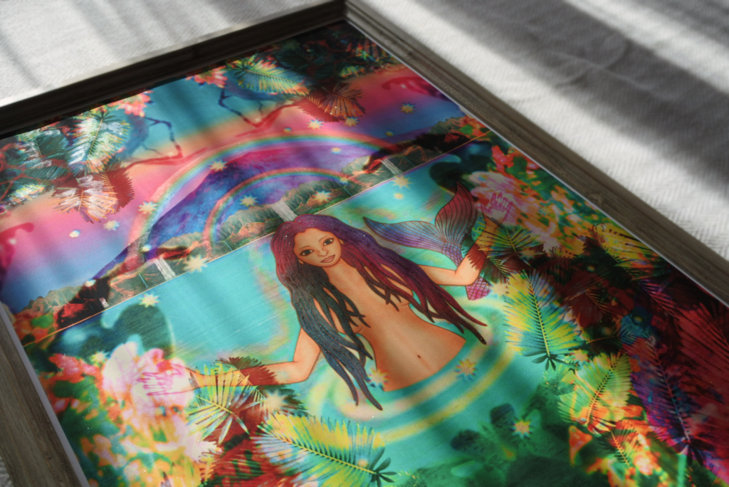 デジタル技法で描画した絵を高品質のファインアート紙に高精細ジクレープリントし、水晶の粉とホログラム絵具で着彩し”生命”を吹き込みます。